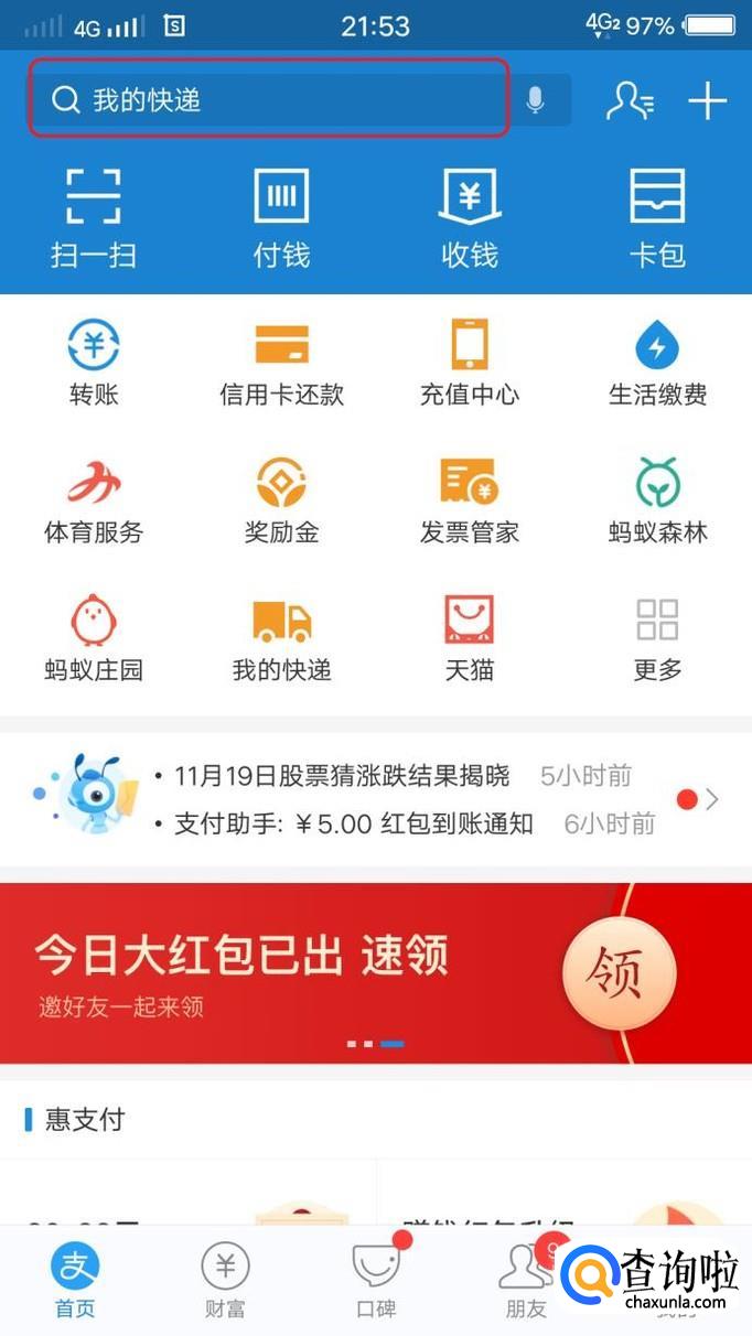 红包搜索码的用法很简单,如图所示,在支付宝首页最上方的搜索框,输入搜索码,点击搜索,就可以领红包了。