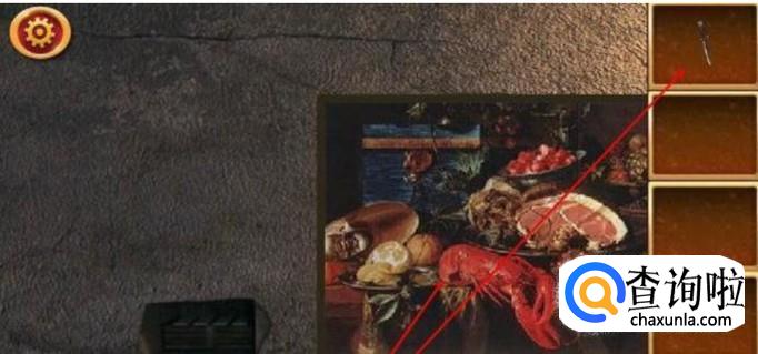 在壁炉的上方有一个壁画,点击壁画,会出现一些打乱的拼图,將它们一一拼好。再点击壁画,將壁画右移,会出现一个小盒子,再点击右边框框里的铁锤敲碎小盒子,会得到一把小刀
