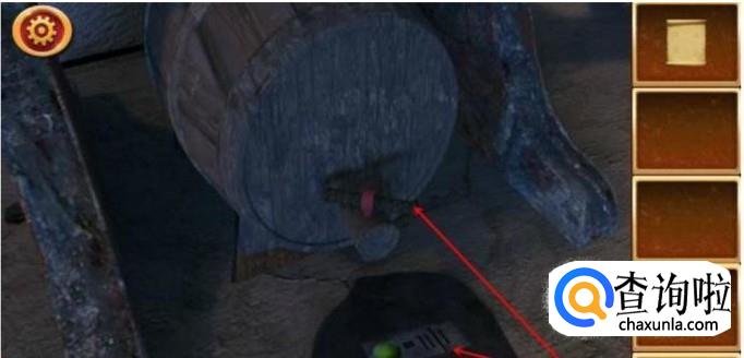 点击桌子下面的木桶,拖动木棍放到木桶的嘴上,向前推动,会得到一个提示,即绿色等于3