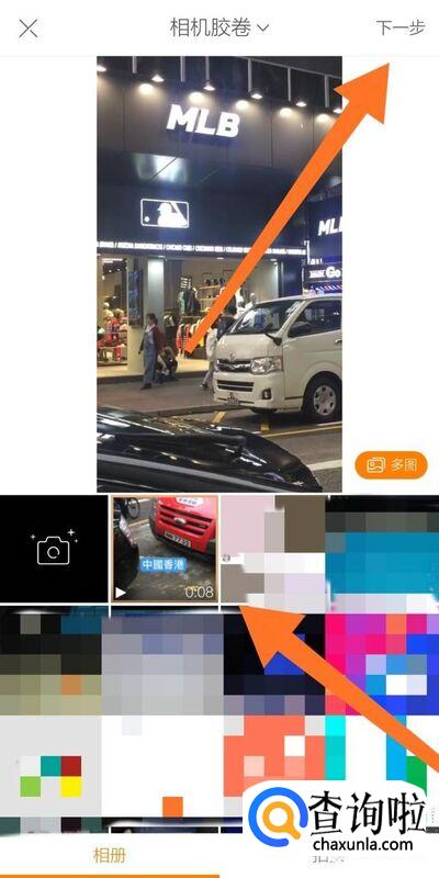在相机胶卷页面选择需要上传的视频,然后点击屏幕右上角的“下一步”。