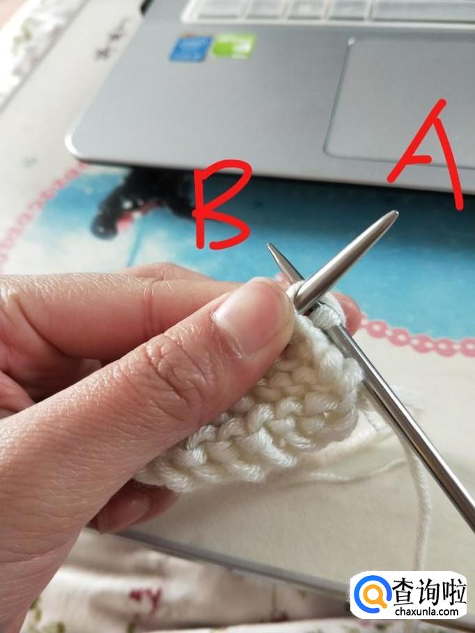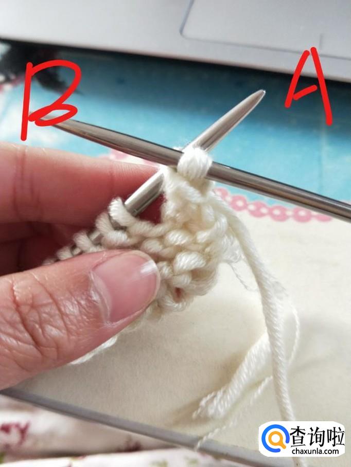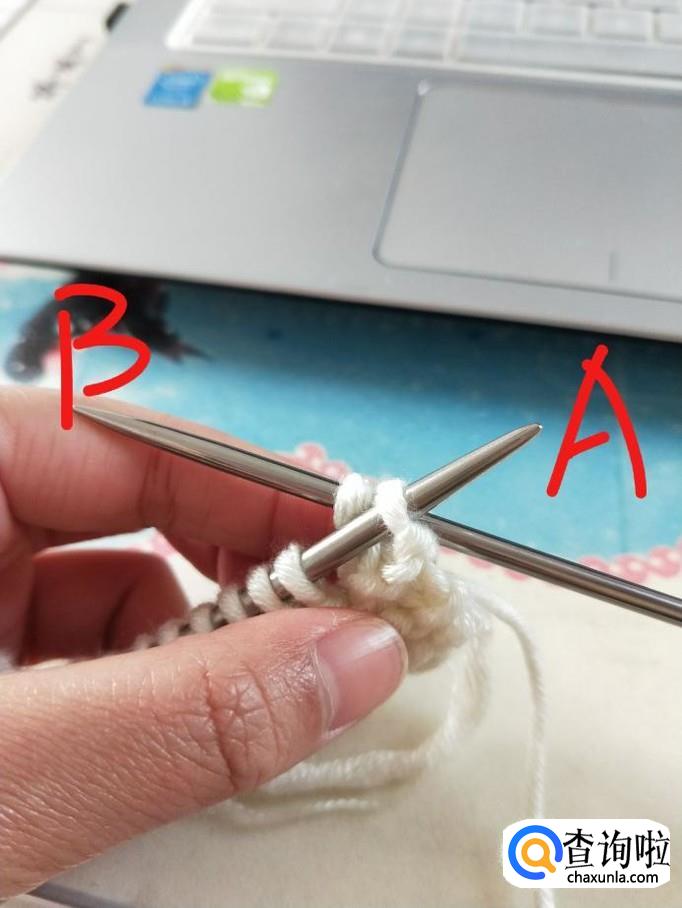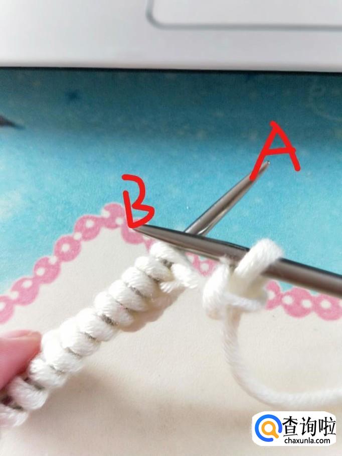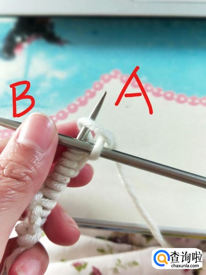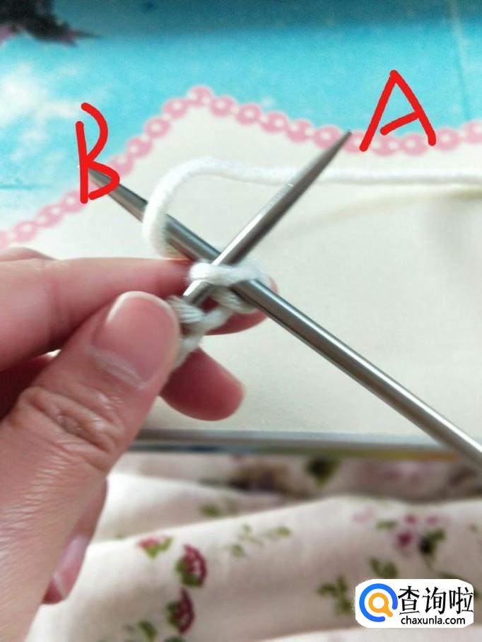 行针:右手握B针,从箭头处穿过,右手将毛线从B针下方绕上来并置于A针下方,稍稍拉一下,B针将刚才绕的线挑起,A针退出,第一针就织好了