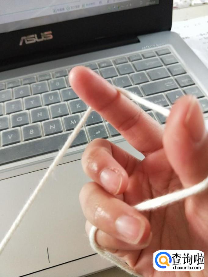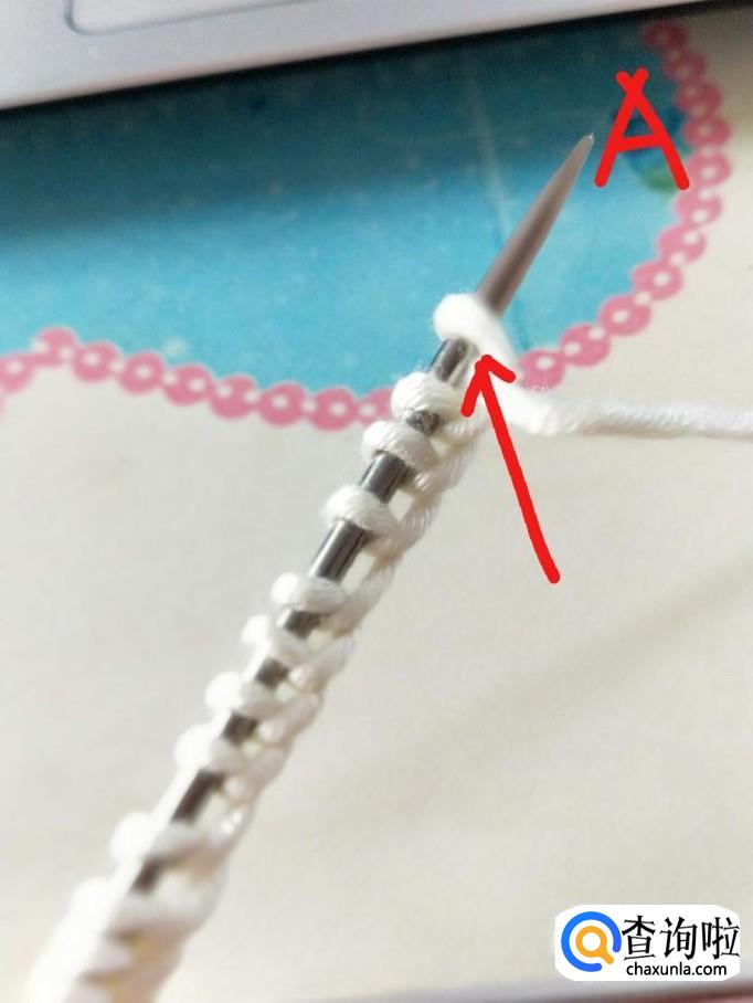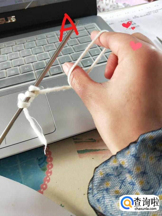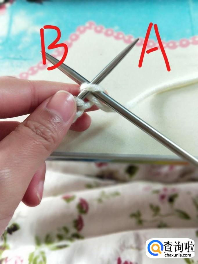 起针:左手握住A针,将毛线前端压在A针下,绕过右手拇指和食指