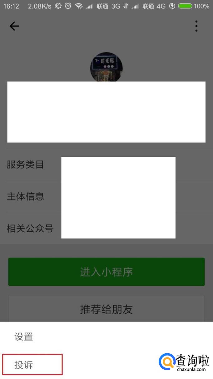 接下来,页面会跳转到程序开发者页面中,点击页面右上角竖着的“····”图标,在页面底部弹出的菜单中选择“投诉”菜单选项。