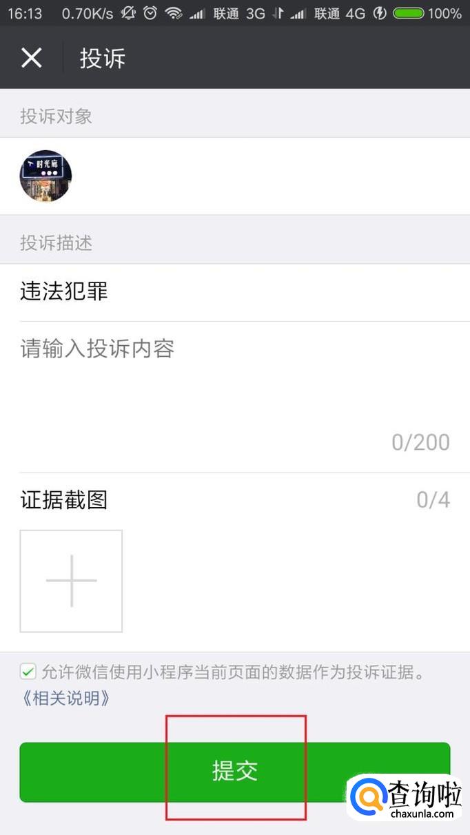 最后,我们在举报页面中输入该小程序的违规理由,还可以添加一些违规截图,填写完毕之后,点击“提交”按钮即可。