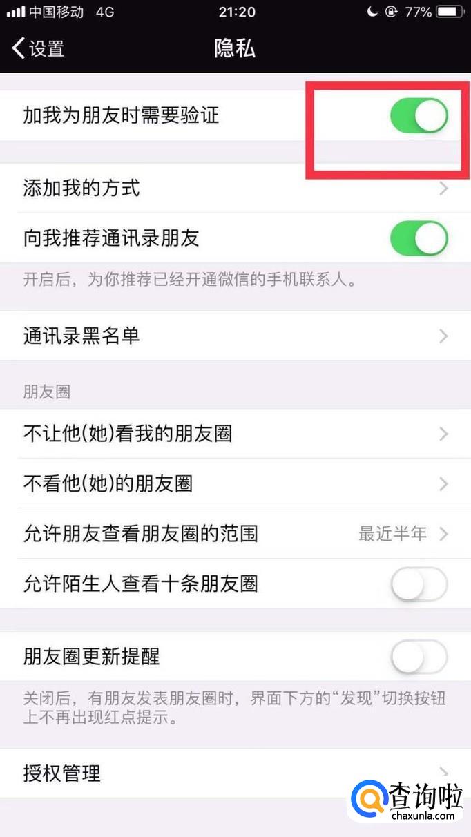 接着点击开启加我为好友需要验证开关,如下图所示。