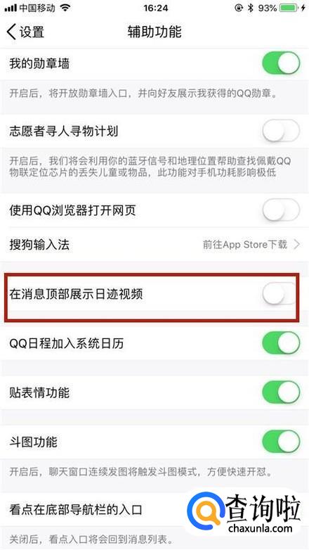 最后点击关闭在消息顶部显示日迹视频开关就可以了。你学会了吗?赶快动手试一试吧!
