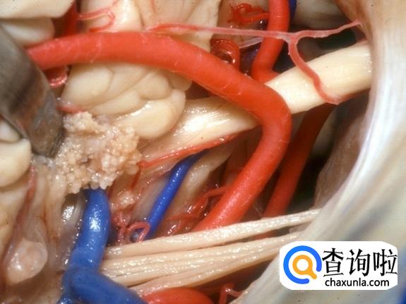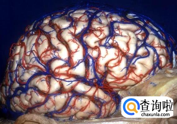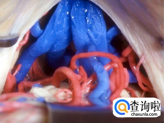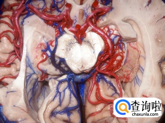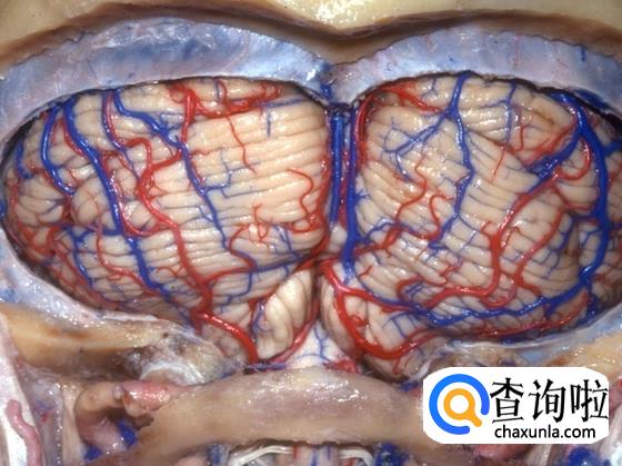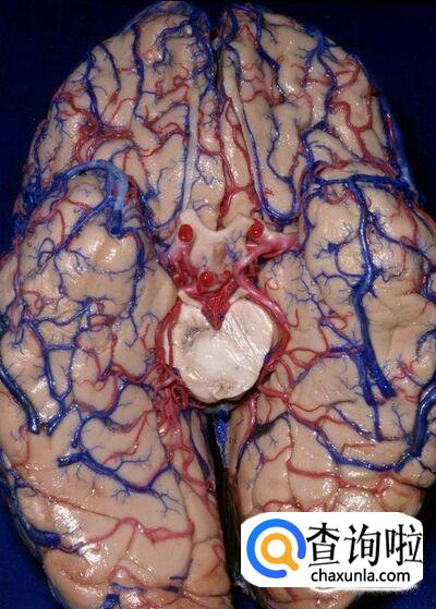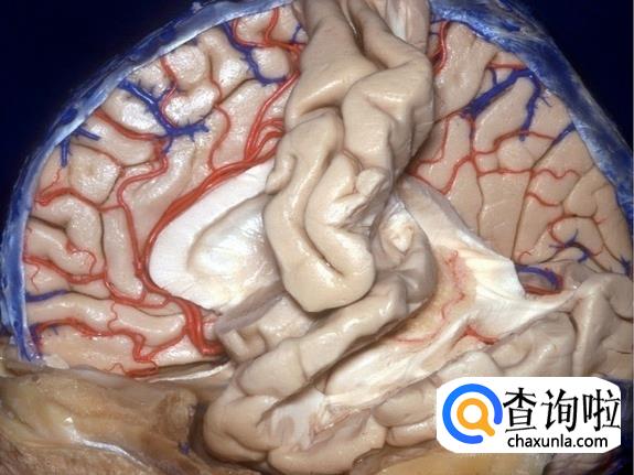 这张解剖图中,左大脑基本已被移除,可以看到右脑的表面和左右脑中间的物质。动脉和静脉在大脑组织中穿行。位于中部较大的白色、喇叭状结构是侧脑室,内部充满了脑脊液,为大脑提供缓冲。缓冲带可以为大脑提供更好的休息,使大脑放松。