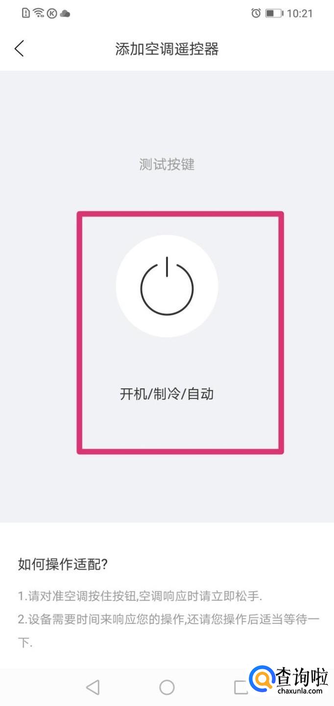 最后点击屏幕中的电源图标完成适配操作就能够用我们的手机控制空调了。