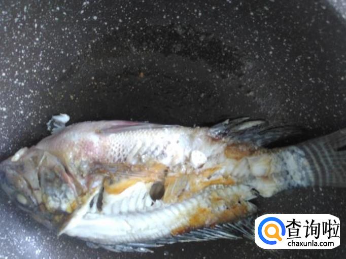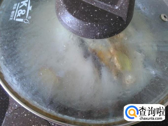 把鱼骨煎至两面金黄色后,放姜片加1碗水盖上盖子小火炖。