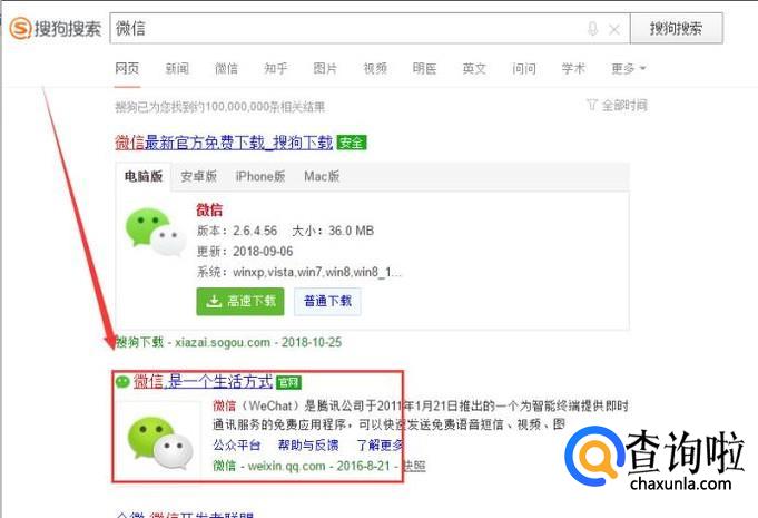 通过搜索工具搜索“微信”,在搜索结果中点击进入官网。