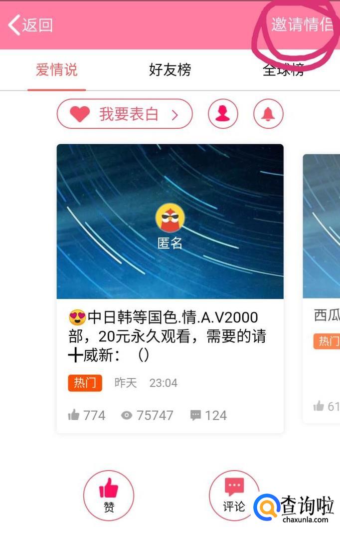 右上角有一个选项是邀请情侣,点击,然后选择自己的情侣就好啦