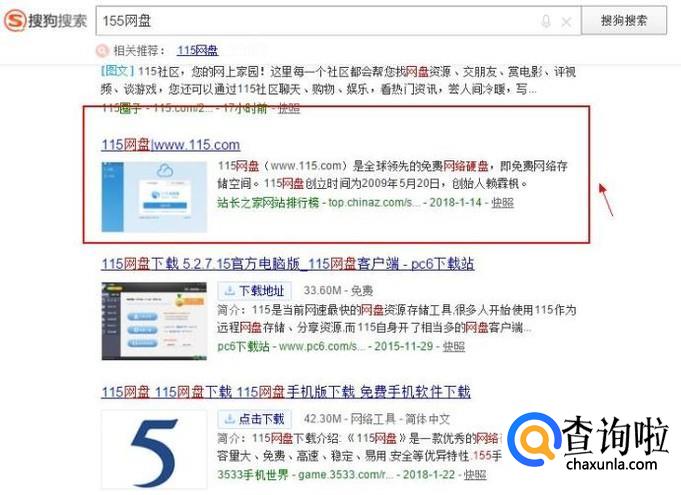 搜狗搜索115网盘,找到如图所示的官网点击进入。