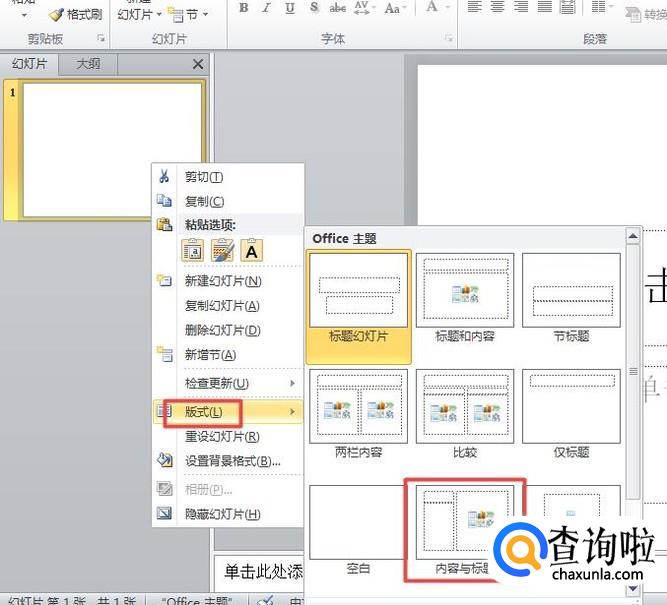 弹出的界面,我们点击版式,然后我们点击内容与标题,想要做一个好看实用的ppt,版式的选择是很重要的;