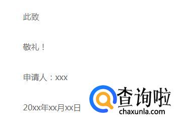 之后在下一行的开头处写上“此致敬礼,”下一行写上“申请人:XXX。”下一行写上“申请日期”即可。如图,便是写好的范文,可参考着来写。