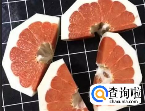 切开一半的柚子露出红红的果肉,这时候再用刀将已经分成四分之一的柚子划开,切成四块。