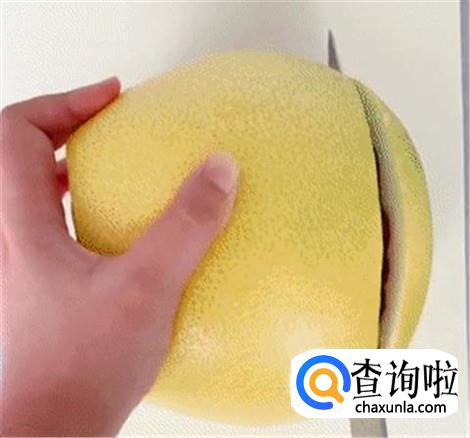 将柚子皮都削掉,要是懒得动 不削皮也行,然后把削好皮的柚子从中间切开。