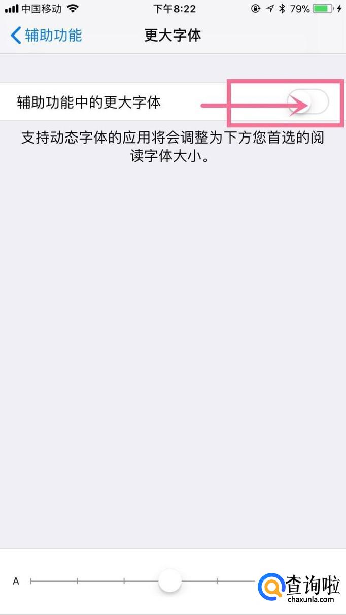 接着点击开启,更大字体开关,如下图所示。
