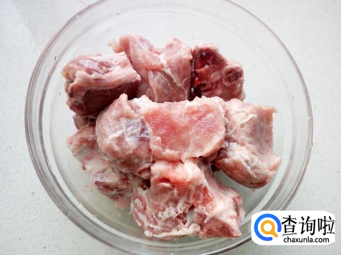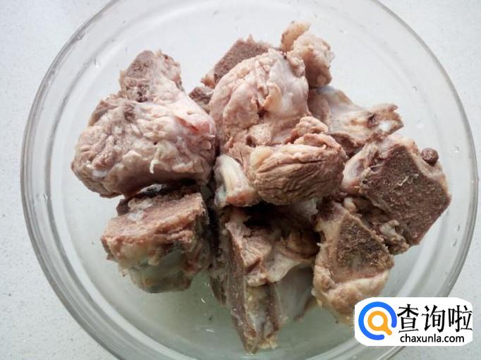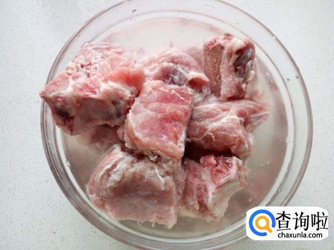 脊骨用刀分割成块,放入清水中浸泡一下,去除上面的血水,然后用水清洗干净,备用。