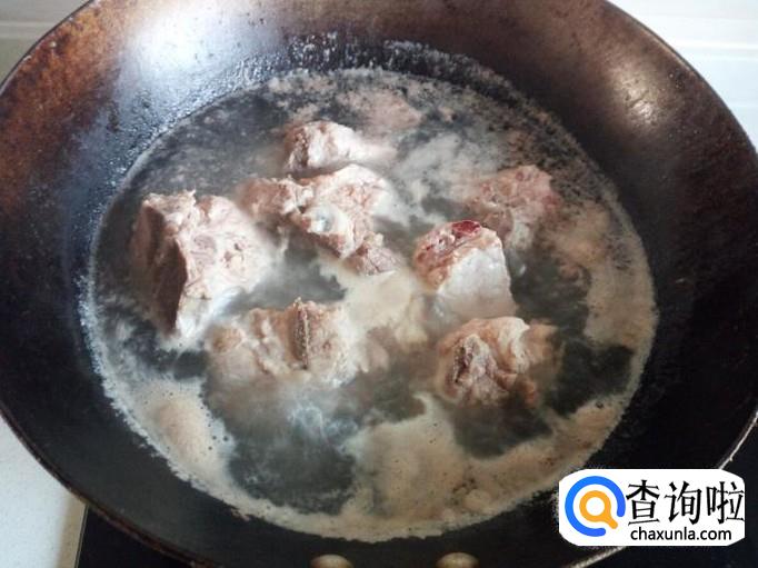 把脊骨放入冷水锅中,烧开,开锅后煮一分钟,然后把脊骨捞出来,用水清洗干净(血水和沫子),沥干水分。