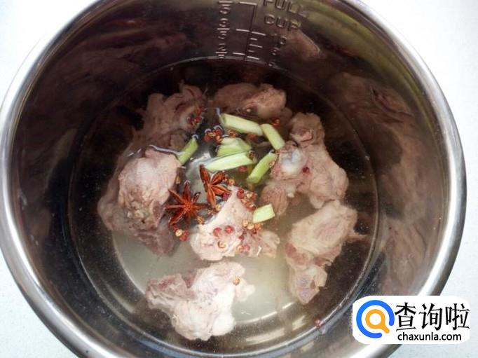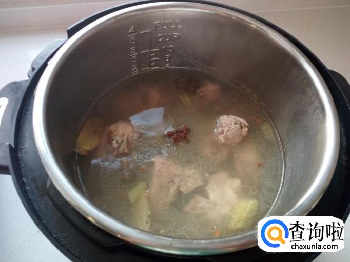 把煮过的脊骨放入电压力锅中(也可以用锅炖,用压力锅比较省时间),放入料酒,八角,花椒,葱姜,少许白糖,盐。然后盖上盖,把电压力锅设在肉/鸡档上(12分钟),通电压熟后备用。
