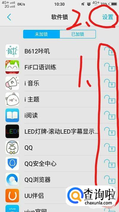 最后,点击你想要上锁的软件的右边的锁的图案。在右上角的"设置"里面可以修改密码。