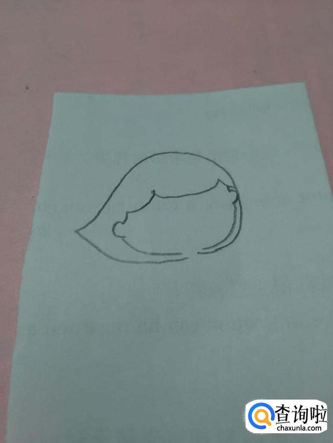 在头发上,画四条相交的弧线,相交处画成隆起的尖,表示刘海。