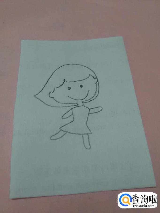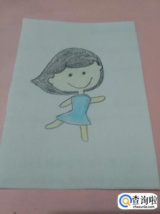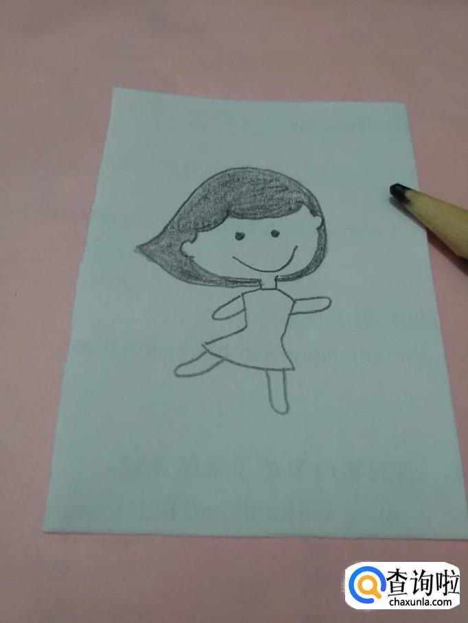 在连衣裙的四个角,各画一个长条形状,表示正在跳舞的胳膊和腿。线条就画完了。