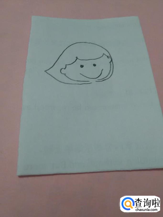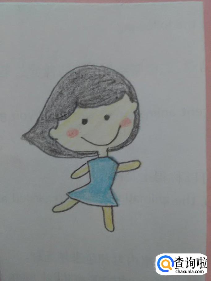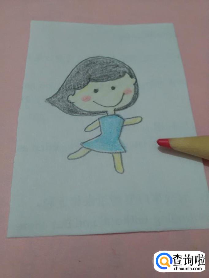 最后,用粉色在嘴的左右两侧各画一个椭圆形,表示粉色的小脸蛋,卡通人物女孩就画完了。
