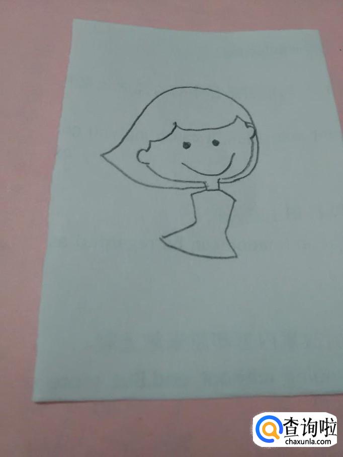 在头部下面,先画两条竖线,表示脖子,在脖子下面,画出小小的无袖上衣和宽宽的裙摆,表示连衣裙。