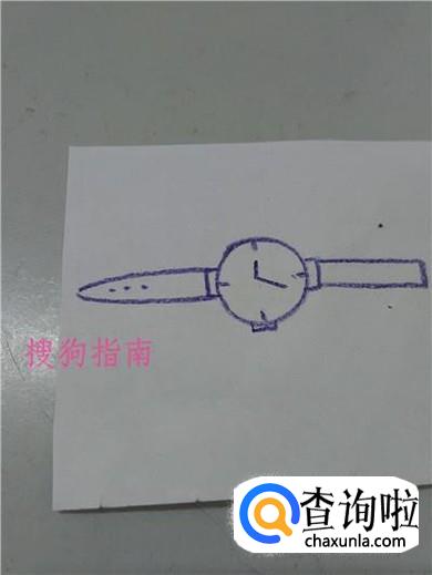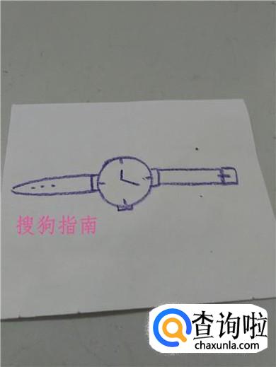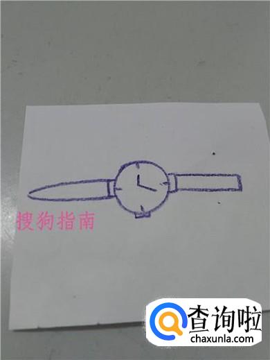 在表的左侧画两条相交的弧线,在表的右侧画一个长方形,表示表带。