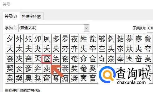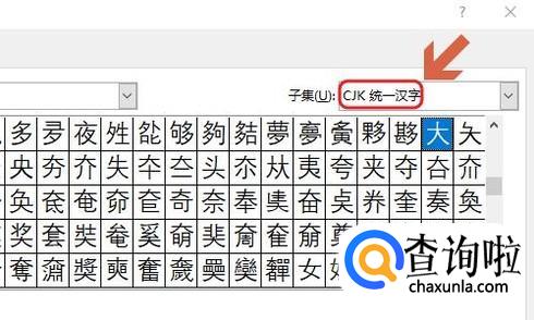 在弹出的符号对话框右侧的子集中勾选为“CJK 统一汉字”,然后下面的文字列表中就能找到这个生僻字了,不过有时候相近字很多,需要认真查找才行哦;