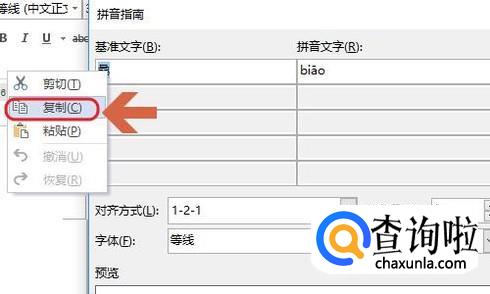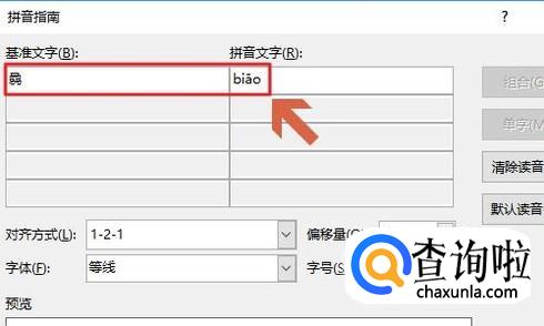 接着在弹出的拼音指南对话框里,就会自动显示这个字的拼音了,当然在该对话框直接复制文字然后粘贴到其他位置也是可以的;
