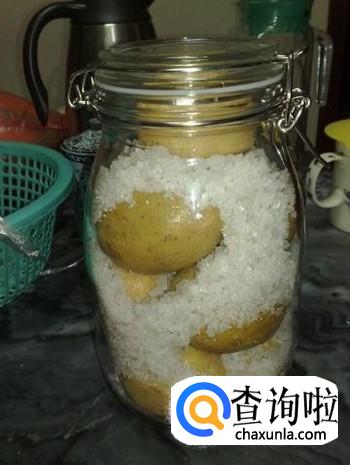 最后把控干水分的柠檬放入消过毒的玻璃容器中,一层盐一层柠檬这样子放。