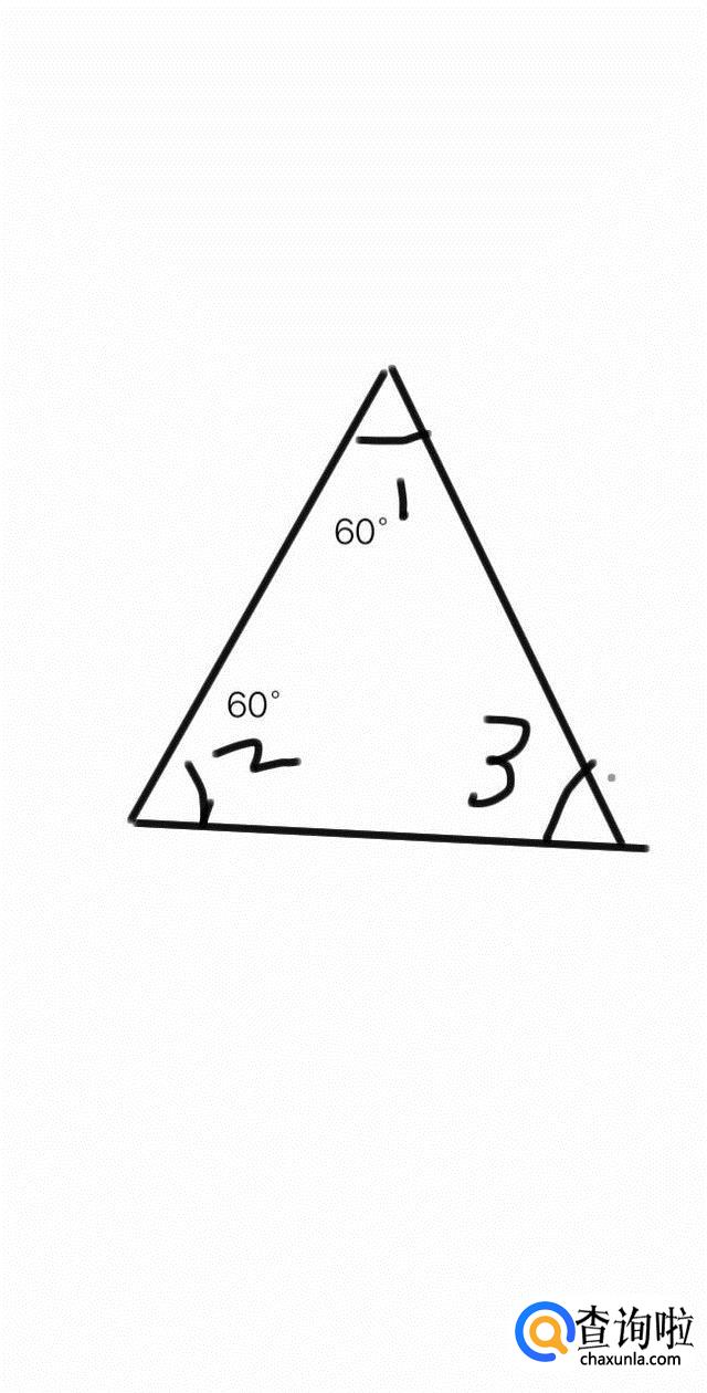 有两个角相等且都为60°。因为∠1=∠2=60°,由内角和为180°,所以∠3=60°,所以三角形三边相等,所以三角形为等边三角形。