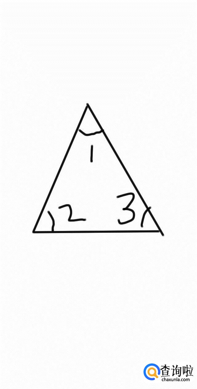 三角形三角相等。因为∠1=∠2=∠3,三角形内角和为180°,所以三角形各角都为60°,三边相等,所以三角形为等边三角形。