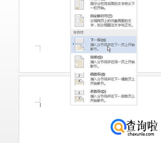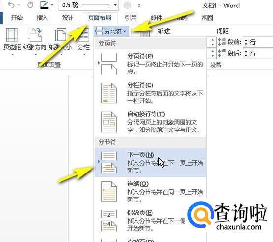 我们打WORD文档,鼠标点击页面布局选项卡,弹出菜单再点:分隔符;再点:下一页