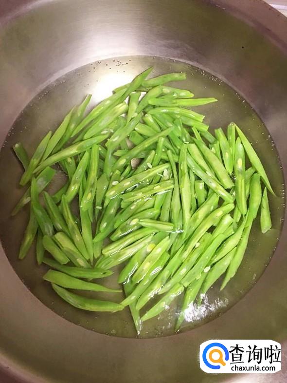 锅中加入适量水,大火煮开放入放入处理好的豆角,再次煮开后捞出,冲凉后放入盘中待用。豆角汆水后再炒制,不仅色泽翠绿,而且也更易炒熟。豆角烹调时必须熟透后才能食用,否则会发生中毒。