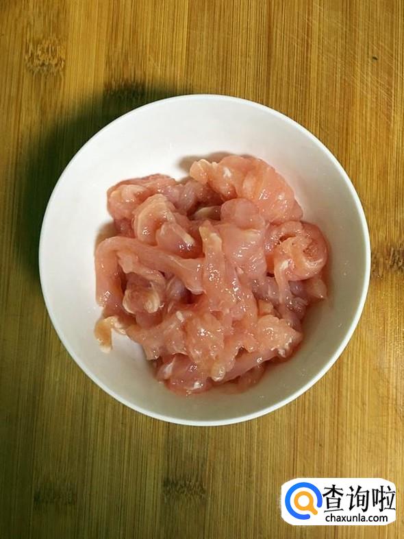 里脊肉用温水冲洗干净后,切成肉丝,放入碗中,依次加入1小勺料酒、生姜粉和1个蛋清,用手抓匀后静置10分钟左右。