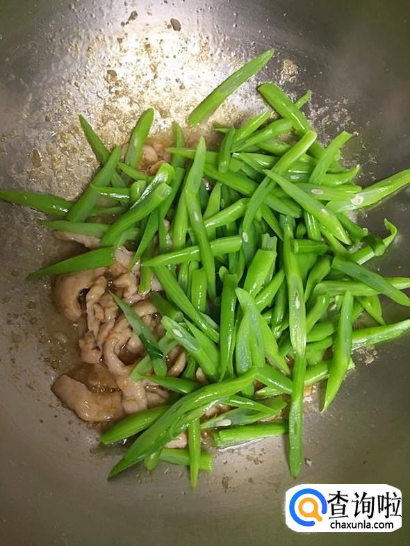把汆水后冲凉的豆角也加入锅中。