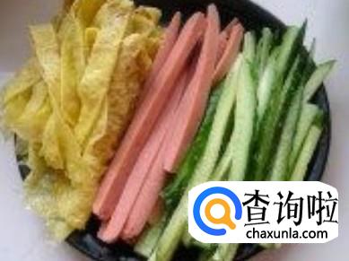 炸熟的豆腐皮切成丝,火腿肠丝,青瓜丝准备好。