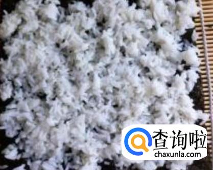把做寿司的竹帘摆好,然后铺上海苔,再铺一层白饭,用勺子压平整,
