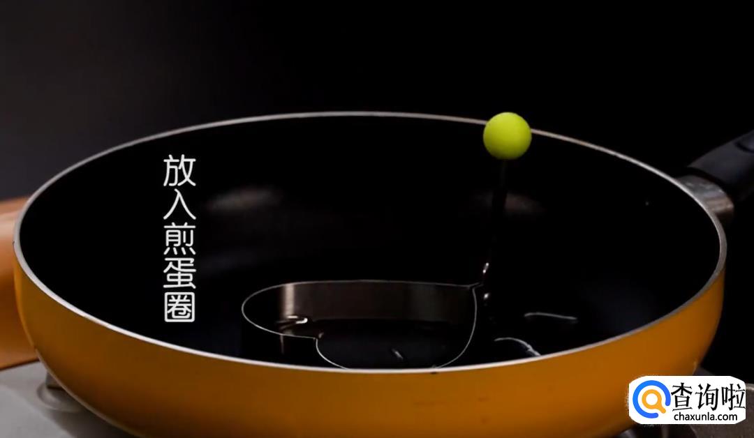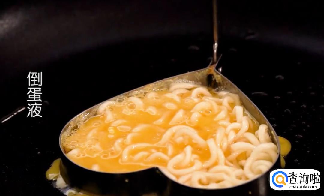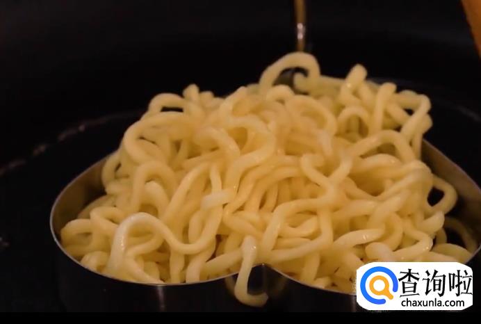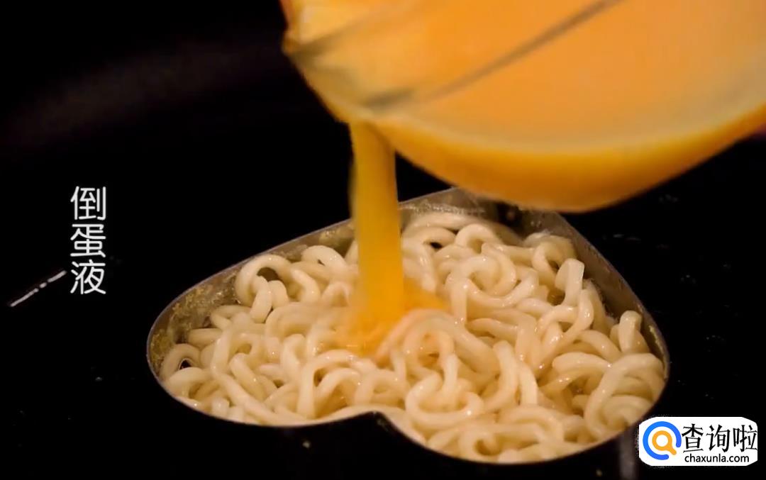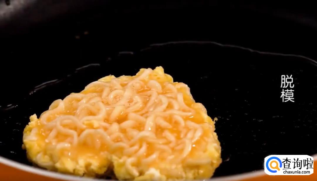煎至定型后,脱模,翻面,两面煎至金黄后盛入盘中。用同样的方法,再煎一个泡面煎蛋。