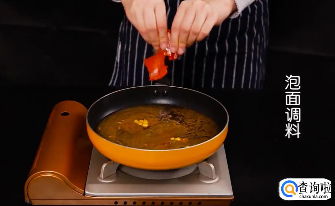 炸虾泡面:泡面、虾、泡面调料包、蘑菇、荷兰豆、萝卜、菠菜、油