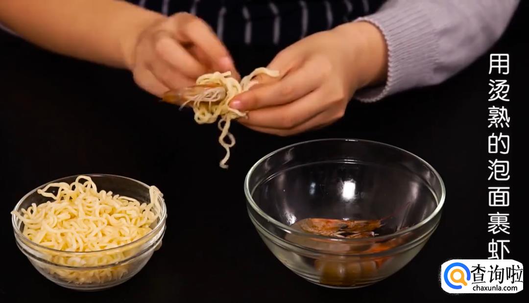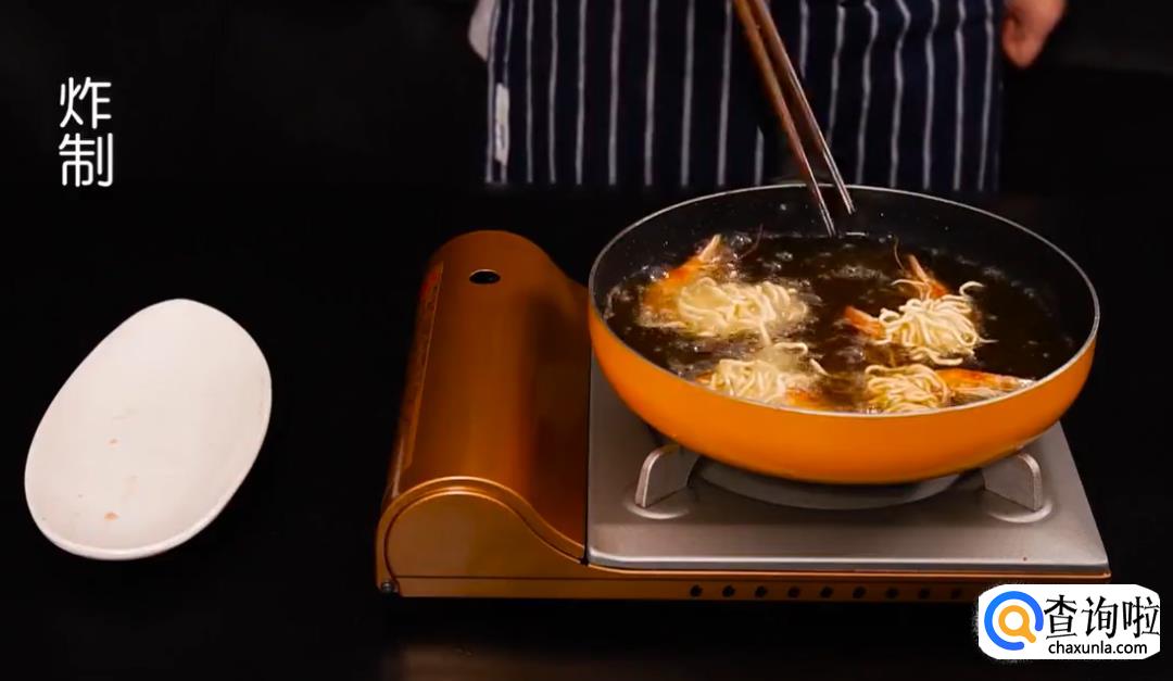 将烫熟的泡面裹在腌制好的生虾上后,放入油锅中炸制。