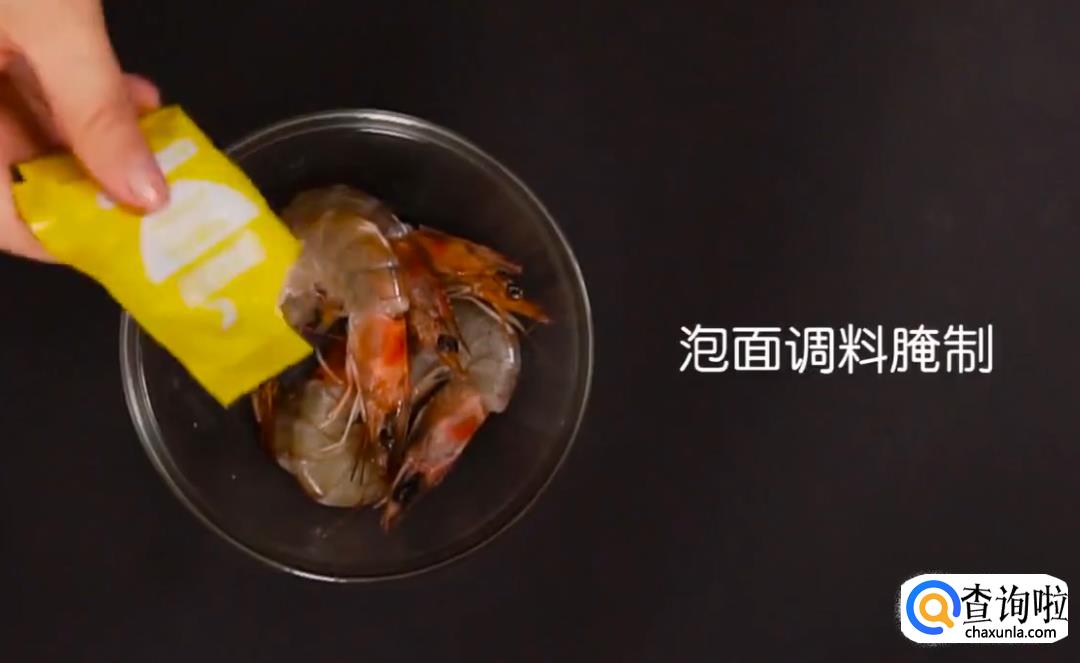 将泡面调料放入生虾中拌匀,腌制一会儿。