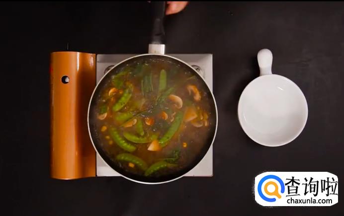 另取一锅,在锅中倒水,加入泡面调料包、蘑菇、荷兰豆、萝卜、菠菜煮熟。煮熟后,盛入盘中。