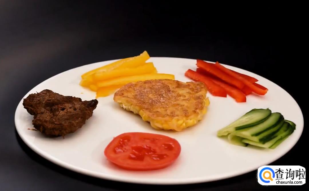 泡面汉堡:泡面、鸡蛋、油、番茄酱、黄瓜、熟牛排、红椒、黄椒、番茄