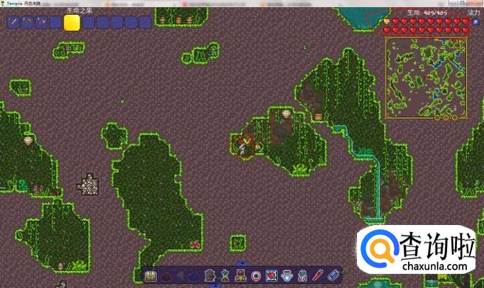 打败肉墙后,我们需要去丛林地底找到生命果,挖掉它后会掉落生命果,使用后会永久提升5生命上限,最高可以把生命上限提升到500滴。如图所示