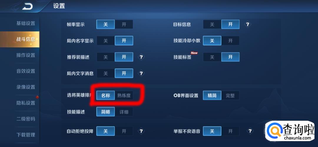 进入设置界面,点击战斗信息,将选将英雄排序选择为按熟练度排序。