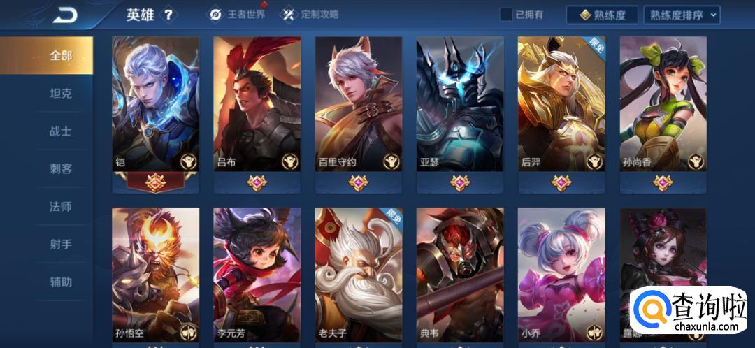 然后回到刚刚的英雄界面,在右上方选择按熟练度进行排序。然后展现的顺序就是之后选择英雄时候的排序了。